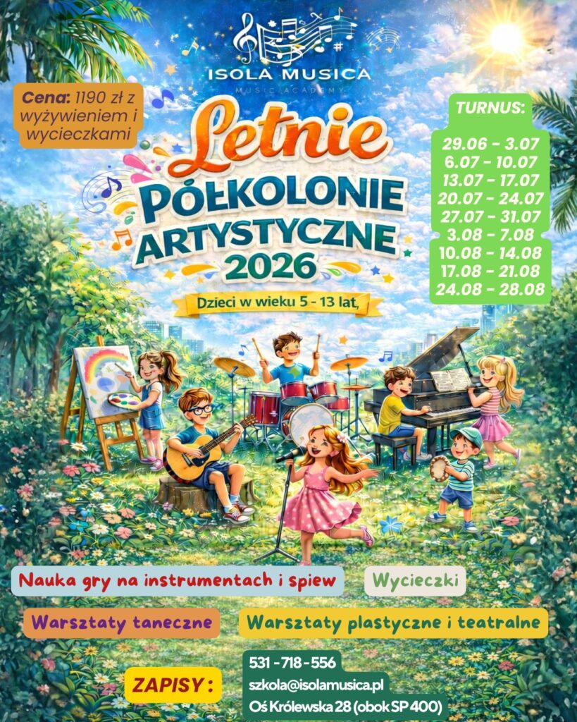 Lato w mieście nie musi być nudne! W Isola Musica przygotowaliśmy wyjątkową wakacyjną ofertę dla dzieci i młodzieży, które kochają muzykę, śpiew, ruch i scenę. Nasze letnie programy to połączenie rozwijających warsztatów artystycznych, świetnej zabawy i twórczej atmosfery, którą pokochali nasi uczniowie.