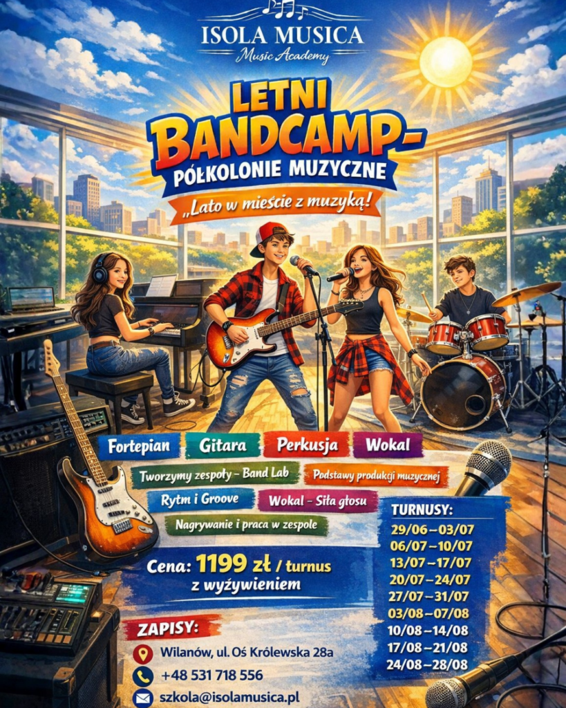 👉 Letni BandCamp – Propozycja dla dzieci i młodzieży, które chcą grać w zespole i rozwijać swoje umiejętności muzyczne w praktyce.